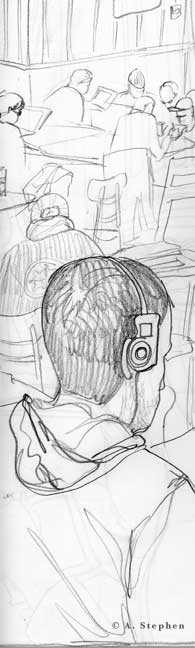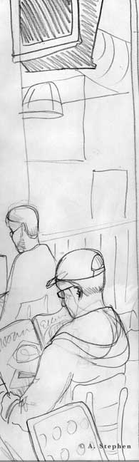 I appreciated John’s advice on drawing unwitting portrait subjects in public (i.e. go for a back view, three-quarters, or profile portrait, so it doesn’t matter so much if they shift around!)